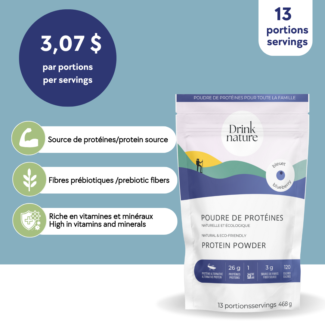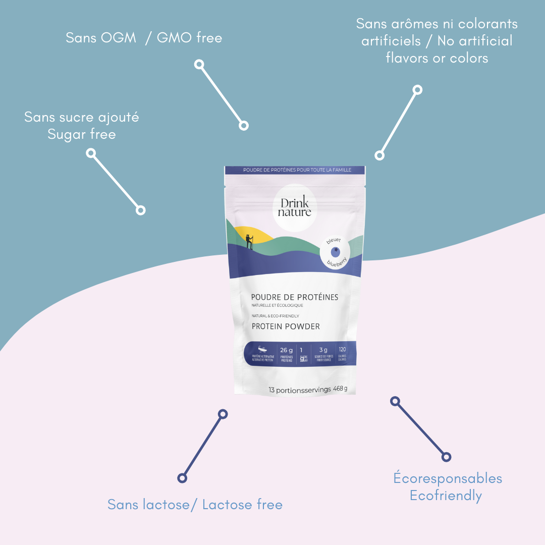 La poudre de protéines aux bleuets Drink Nature combine des sources de protéines innovantes et durables, pour une nutrition complète et respectueuse de l’environnement.